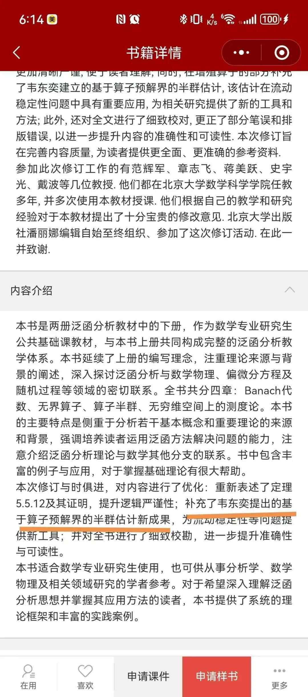记者从北京大学出版社官方小程序中看到,第二版中补充了韦东奕提出的基于算子预解界的半群估计新成果,为流动稳定性等问题提供新工具。不过,这一成果是否被命名为“韦东奕定理”,并未有权威依据。