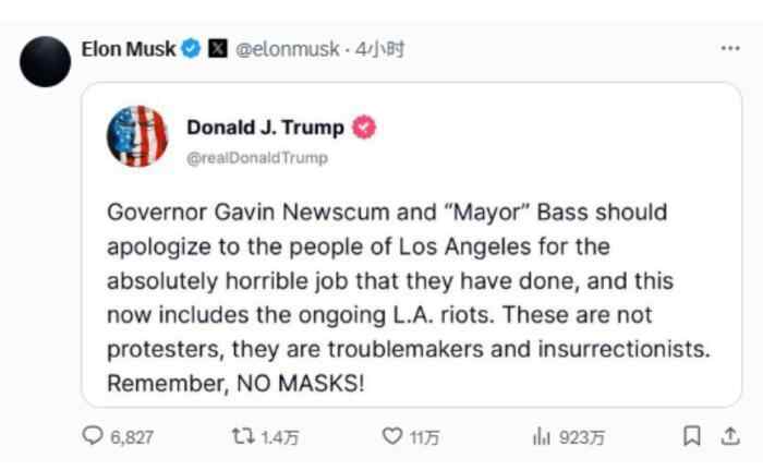 随后,马斯克还转发了多条特朗普在其自创社交平台上发布的有关“洛杉矶骚乱”的帖文和截图。有分析称,这表示了马斯克在该事件中对美国联邦政府的声援。