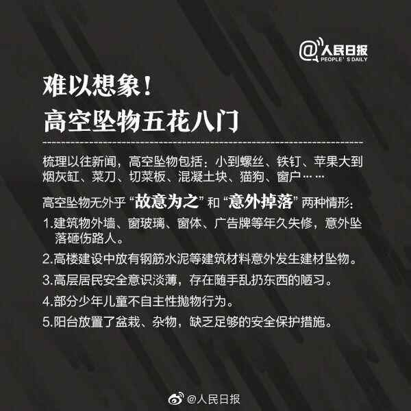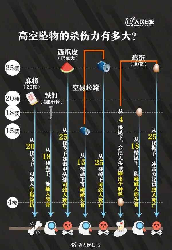 ①4厘米的铁钉:从18楼抛下能插入颅骨;②空易拉罐:25楼抛下可致人死亡;③30克的鸡蛋:4楼抛下可在人头顶砸出肿包;从18楼抛下,能砸破人的头骨;从25楼抛下,冲击力足以致人死亡。④巴掌大的西瓜皮:25楼飞下如击中头部也能要人命。