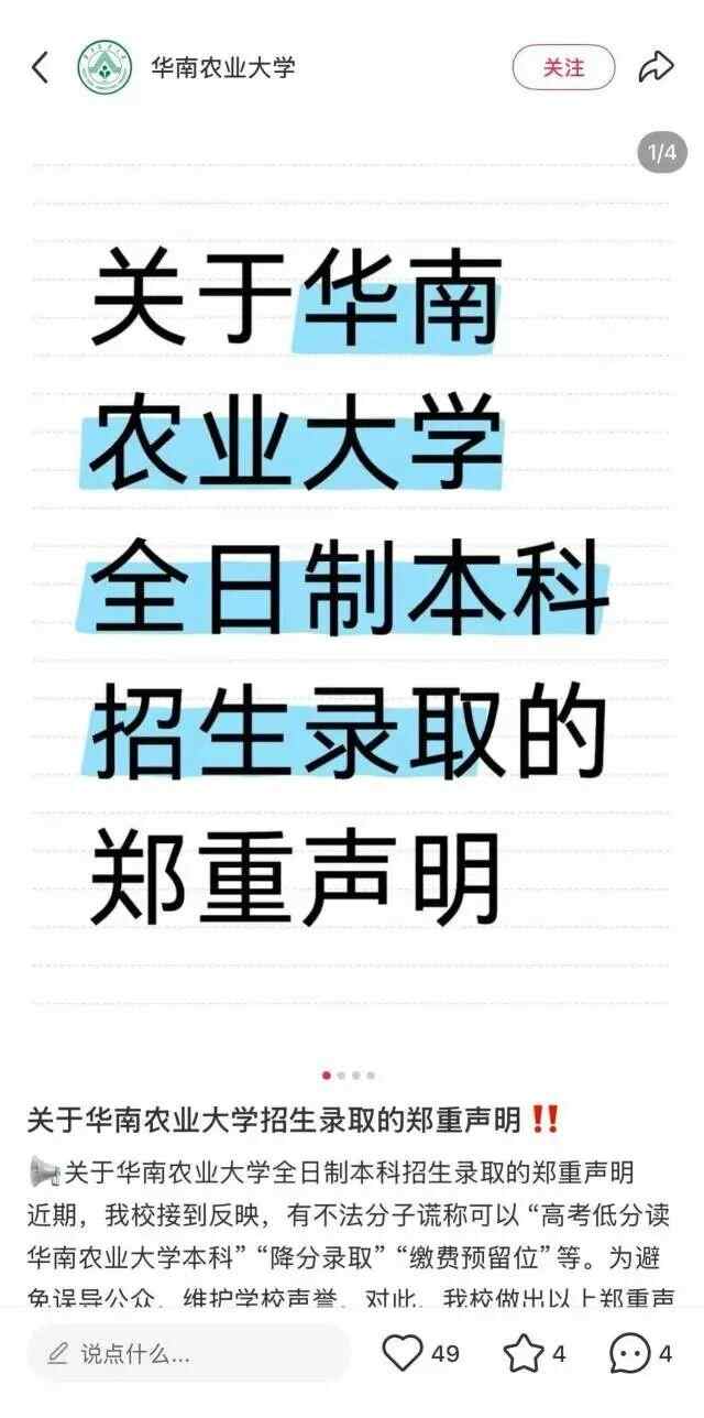 6月9日,华南农业大学在网上发布《关于华南农业大学招生录取的郑重声明》,称近期接到反映,有不法分子谎称可以“高考低分读华南农业大学本科”“降分录取”“缴费预留位”等。