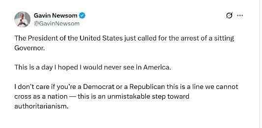 纽森9日上午在社交媒体发文说,特朗普竟然威胁要逮捕他,这种行为是美国“不能逾越的底线”。
