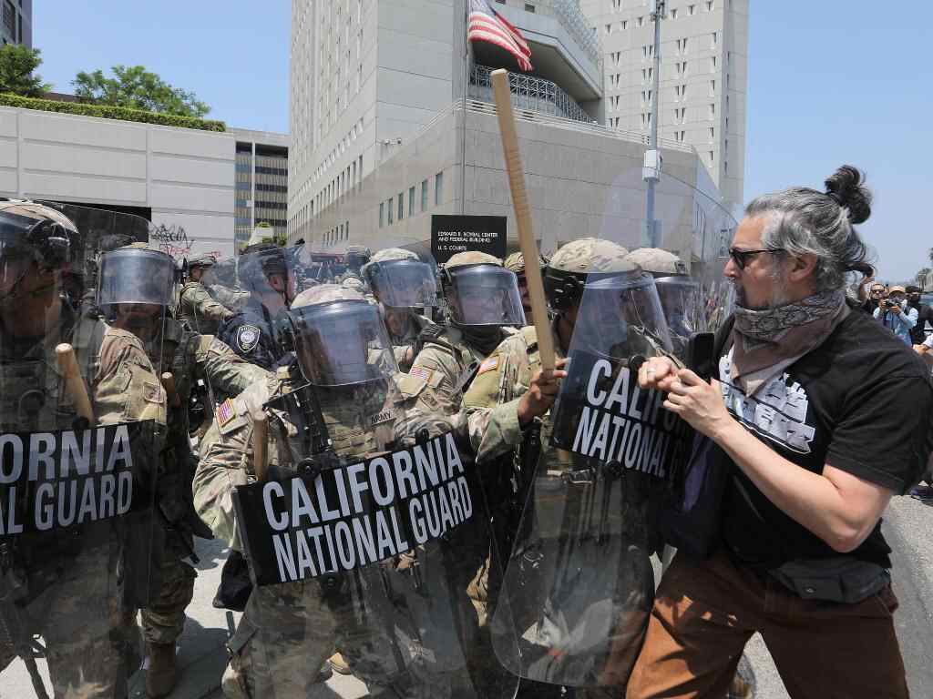 6月8日,在美国加利福尼亚州洛杉矶市中心的联邦执法机构门前,抗议者与国民警卫队人员发生冲突。新华社发(邱晨摄)