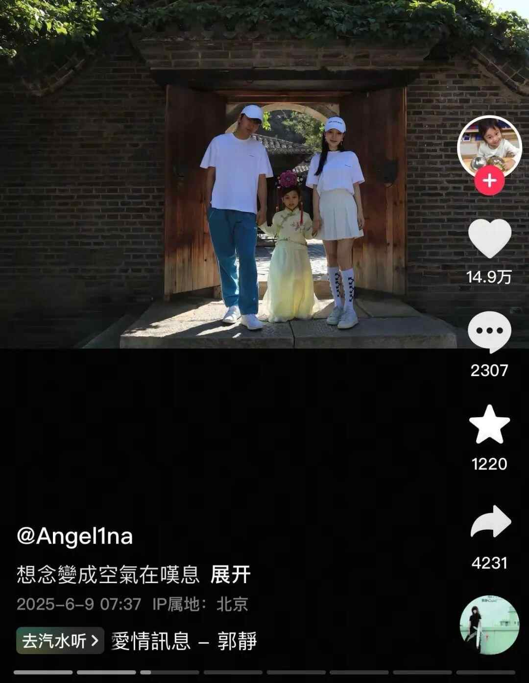 6月9日,贾乃亮、李小璐的女儿甜馨在社交平台晒照,罕见出现一家三口的合影照片和一些旧照,配文:想念变成空气在叹息。