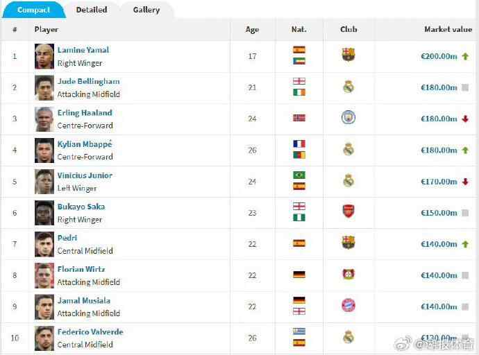 以下为德转最新球员身价TOP10: 1、亚马尔(2亿欧元) 2、贝林厄姆(1.8亿欧 元 ) 2、哈兰德(1.8亿欧 元 ) 2、姆巴佩(1.8亿欧 元 ) 5、维尼修斯(1.7亿欧 元 ) 6、萨卡(1.5亿欧 元 ) 7、佩德里(1.4亿欧 元 ) 7、维尔茨(1.4亿欧 元 ) 7、穆西亚拉(1.4亿欧 元 ) 10、巴尔韦德(1.3亿欧 元 )