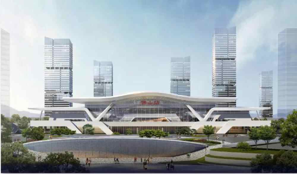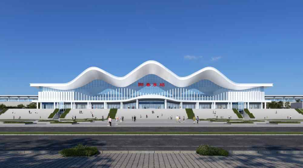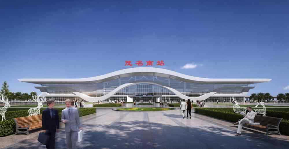 站房以“日出南海 海韵明珠”为主题,用现代的设计手法诠释了茂名滨海文化的特色,主体建筑以海浪为设计原型,优美、坚挺的轮廓象征着城市驾驭江海,破浪前行的发展势头。