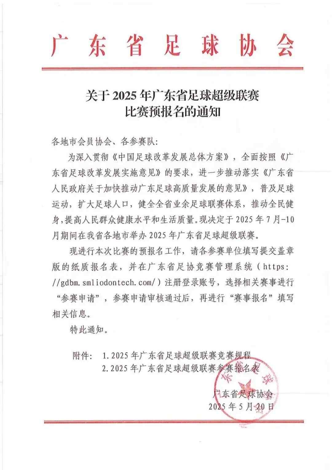 今年的“粤超”将有16支球队参赛,目前处于预报名阶段。据悉,比赛日期为2025年7月至9月,第一阶段地点为省内各赛会制地点,第二阶段为各晋级参赛俱乐部主场。