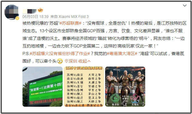 “苏超”爆火后,网友们除了玩梗,也纷纷建议各省“抄作业”。有网友表示,这份“作业”不好抄,但是粤港澳大湾区可以试试。该网友更是“点名”香港,认为香港氛围好,可以牵头。