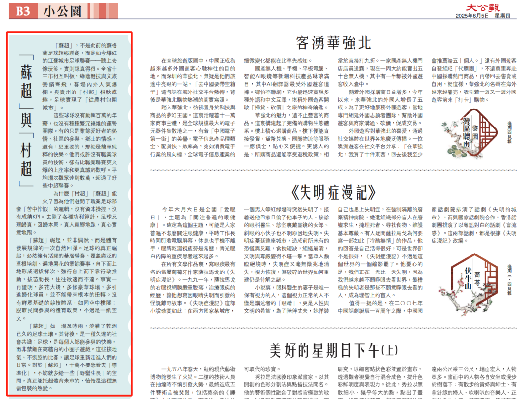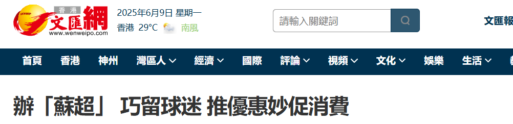 有港媒评论认为,“苏超”与贵州的“村超”相映成趣,足球实现了“从农村包围城市”。谈及“苏超”的爆火,该评论文章表示,这是源自于业余爱好者的热情、社区的参与、乡土的情感和简单纯粹的快乐。