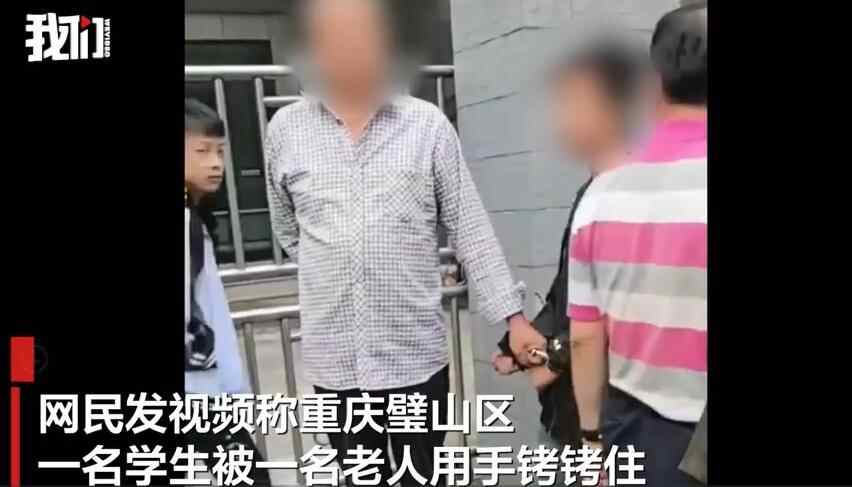 6月10日,网民发视频称,重庆璧山区一名穿着黑上衣满脸稚气的学生站在街头双手被手铐铐住,旁边站着一名老翁,此举引来过往市民驻足围观。