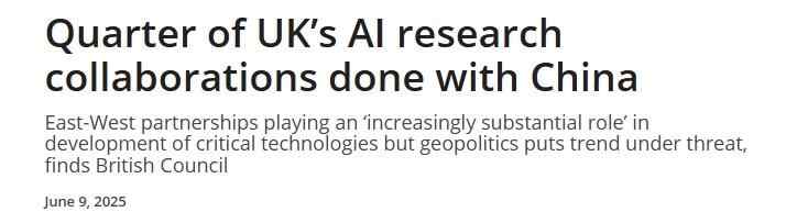 文章进一步分析,与中国大学的合作在人工智能、工程生物学、未来电信和半导体领域正发挥着越来越重要的作用,而这正是英国五大关键技术中的四项。如果英国计划在人工智能领域成为世界领先者,那么与中国的研究合作是不可或缺的。