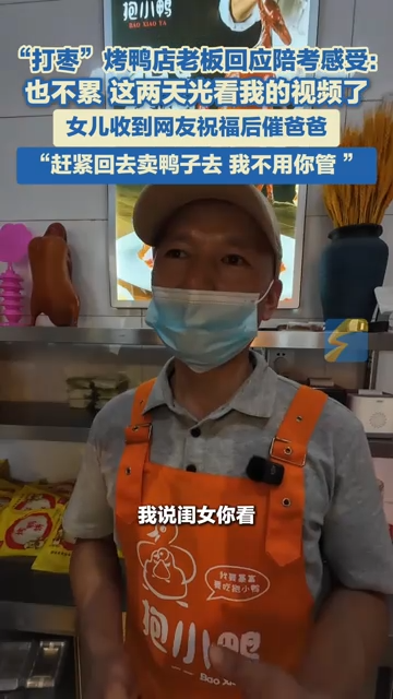 6月10日,山东济南,“打枣”烤鸭店老板回应陪考感受:“也不累,这两天光看我的视频了。闺女非常独立,连饭都不让我做,(高考期间)两次晚饭都她自己做的。”女儿收到网友祝福后催爸爸:“赶紧回家卖鸭子去,我不用你管。”