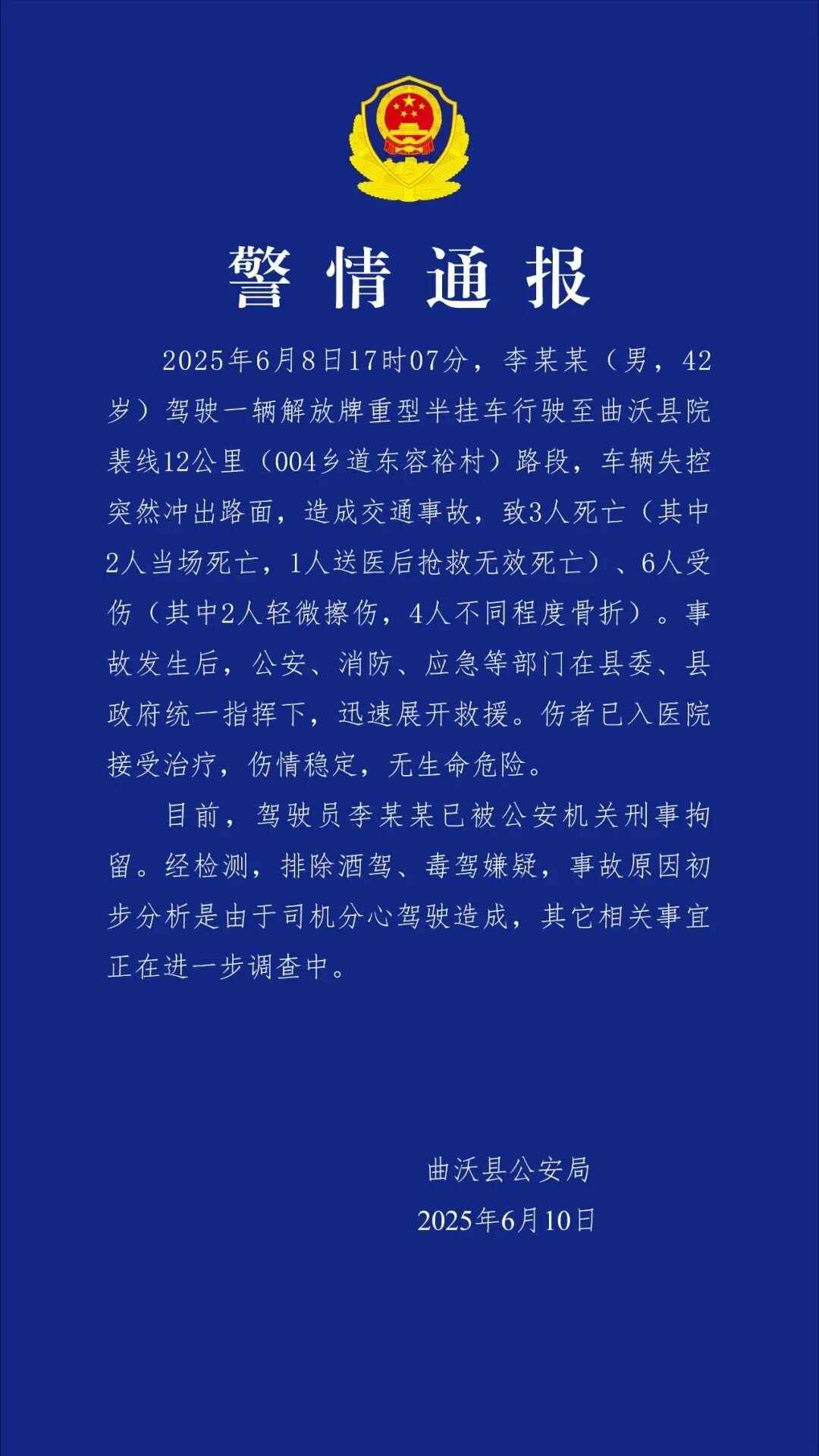 6月10日,山西省曲沃县公安局发布通报: