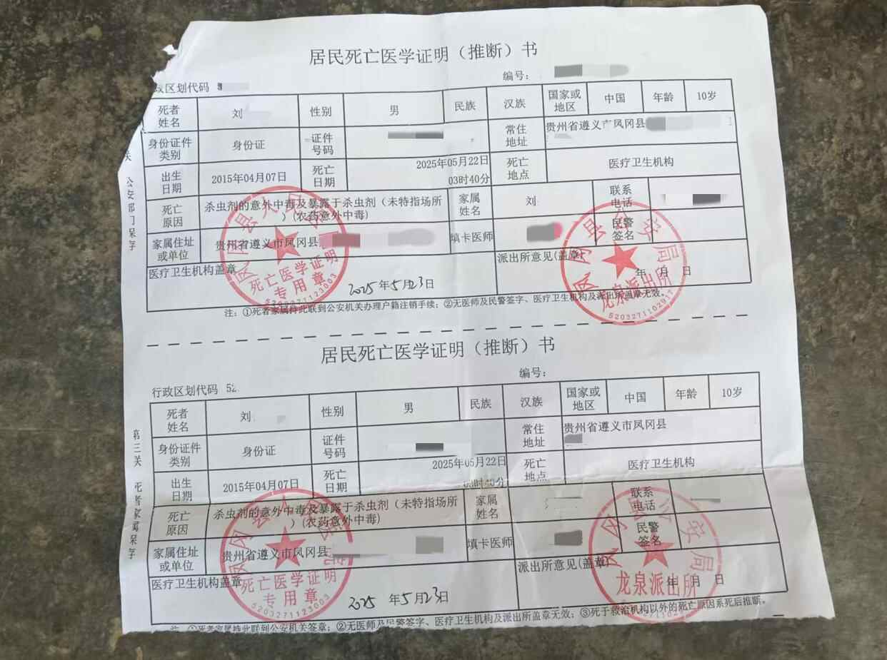2025年5月22日凌晨,贵州省凤冈县发生一起刑事案件:疑因夫妻感情纠纷,32岁的刘某杰涉嫌在家中给10岁儿子和7岁女儿服用农药,导致两个孩子经抢救无效死亡。