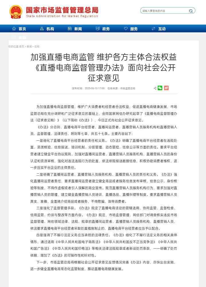 近年来,直播电商行业发展迅速,在促进消费、扩大就业同时,虚假营销、假冒伪劣等乱象逐渐显现,6月10日,《直播电商监督管理办法(征求意见稿)》(以下简称《办法》),正式向社会公开征求意见。该意见由市场监管总局在充分调研和广泛征求意见的基础上,会同国家网信办研究起草。