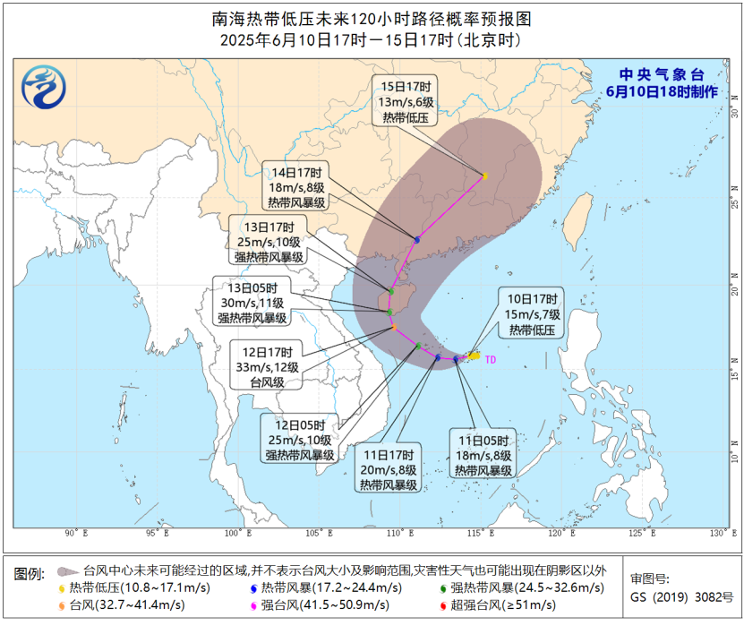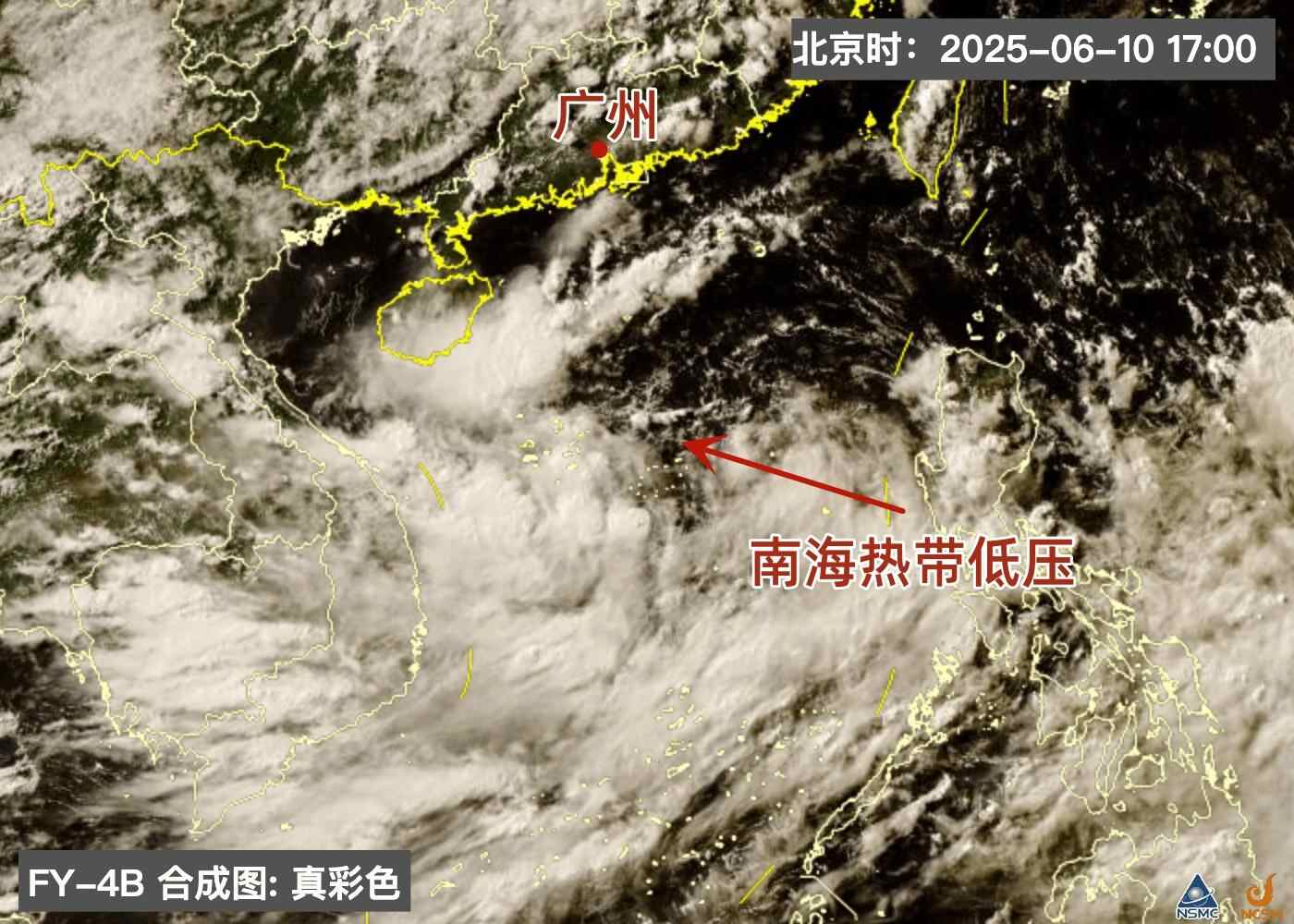 6月10日上午,位于南海中部的热带扰动加强为热带低压。截至10日傍晚,该系统维持热带低压强度。中央气象台、广东省气象台等机构,预计其将加强为今年第1号台风,并有可能在后期登陆海南、广东一带。截至10日,广东“高烤天气”依旧;广东省气象部门10日预计,13日至15日广东将有一次暴雨到大暴雨局部特大暴雨的降水过程;建议各地在风雨来临前,先做好防御准备。