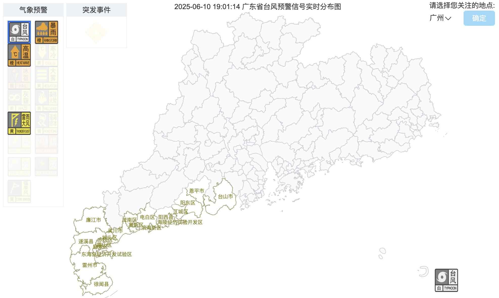 热带低压尚未真正加强为未来的台风,广东沿海多地已开始关注。截至10日19时,东起台山西至徐闻的广东沿海地区,已陆续发布台风白色预警信号。