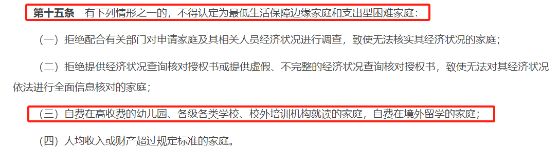 根据2022年印发的《广东省最低生活保障边缘家庭和支出型困难家庭救助办法》(以下简称为“办法”),自费在高收费的各级各类学校就读的家庭不得认定为最低生活保障边缘家庭和支出型困难家庭。去年民政部印发的《刚性支出困难家庭认定办法》于今年1月起施行,不涉及相关条款。