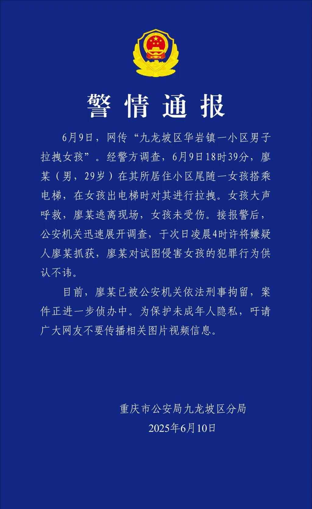 6月9日,网传“九龙坡区华岩镇一小区男子拉拽女孩”。经警方调查,6月9日18时39分,廖某(男,29岁)在其所居住小区尾随一女孩搭乘电梯,在女孩出电梯时对其进行拉拽。女孩大声呼救,廖某逃离现场,女孩未受伤。接报警后,公安机关迅速展开调查,于次日凌晨4时许将嫌疑人廖某抓获,廖某对试图侵害女孩的犯罪行为供认不讳。