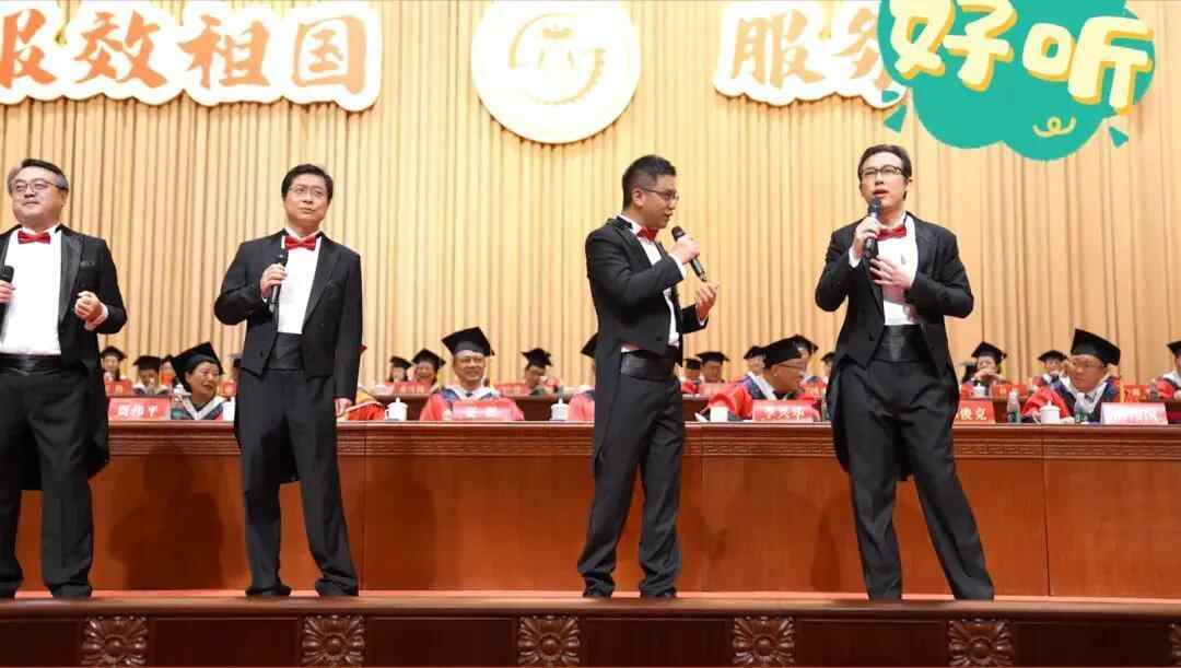 在上海交通大学医学院2025届毕业典礼上,上海交通大学医学院附属第九人民医院“大叔男团”献唱经典粤语歌《红日》,为毕业生送祝福。五位医学专家脱下白大褂,穿上燕尾服,悦耳的歌声引来台下阵阵掌声。