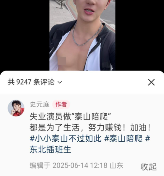 “都是为了生活,努力赚钱!加油!”近日,曾在热播青春搞笑剧《东北插班生》中饰演主角王虎的东北演员史元庭发视频表示,今年接戏比较困难,找了个兼职做泰山陪爬。