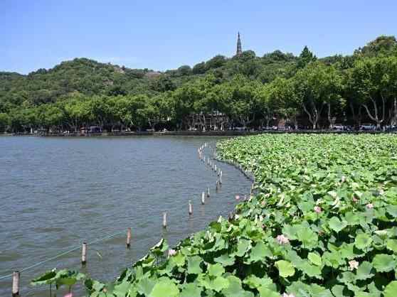 6月16日,雷峰塔、白堤前荷花盛开。近日,浙江杭州西湖多个水域荷花初放,“接天莲叶无穷碧,映日荷花别样红”的夏日美景逐步上线。中新社记者 王刚 摄