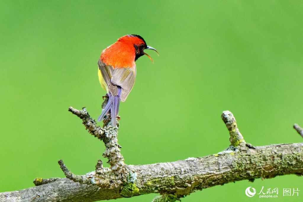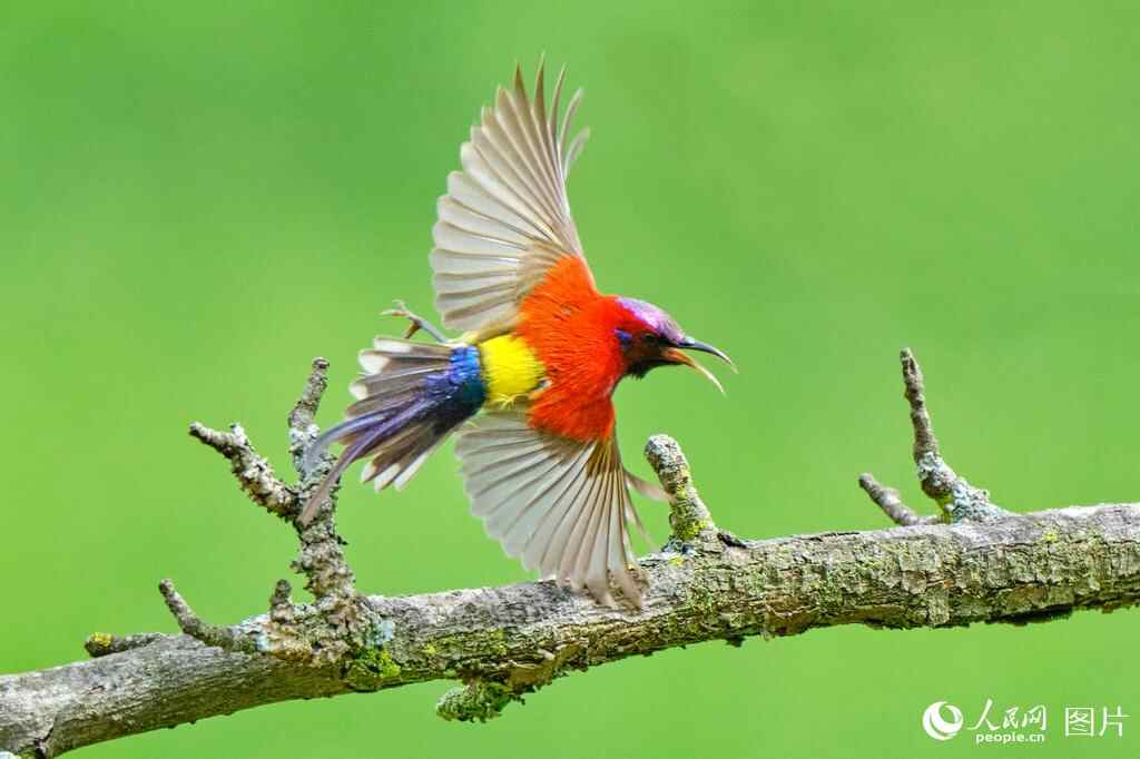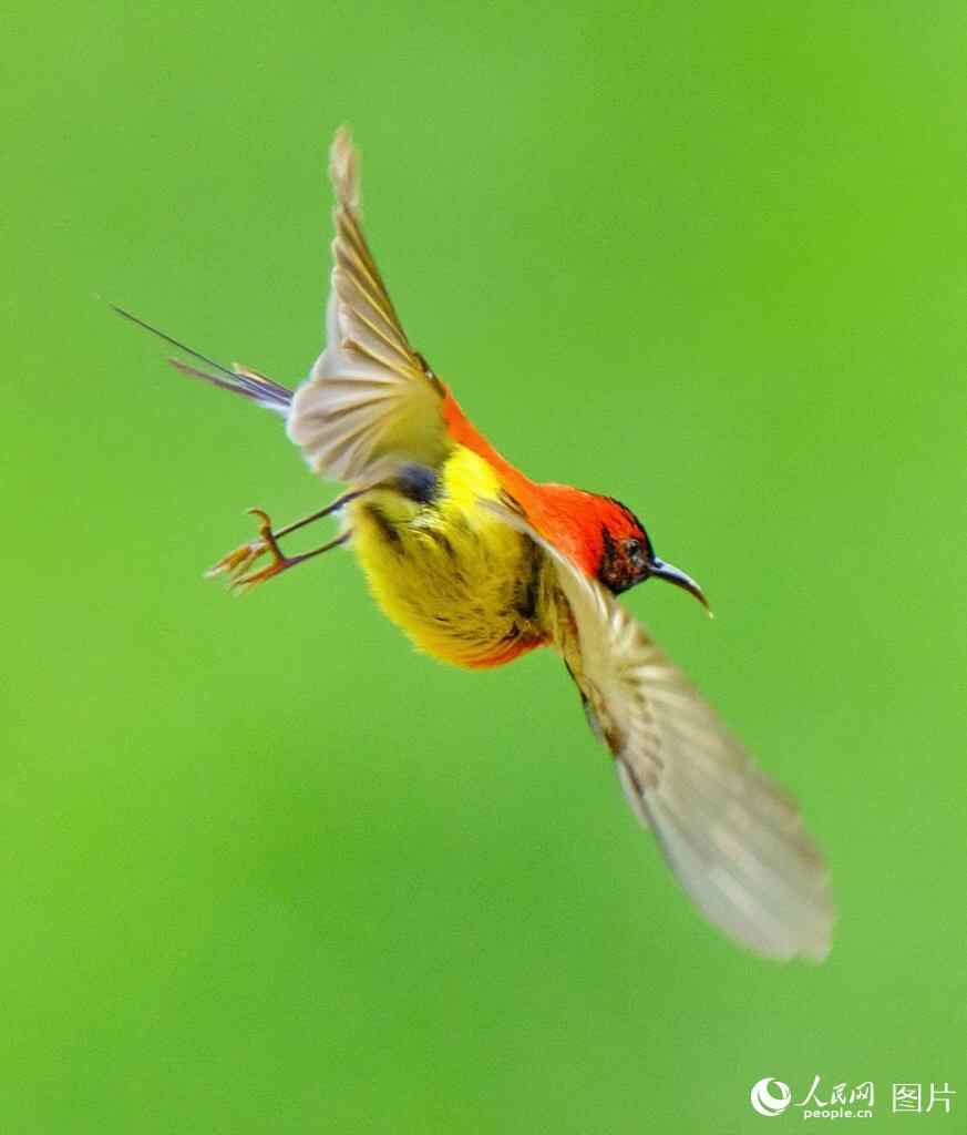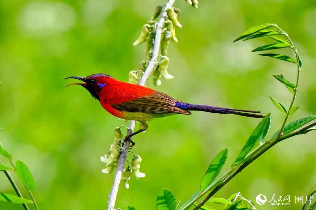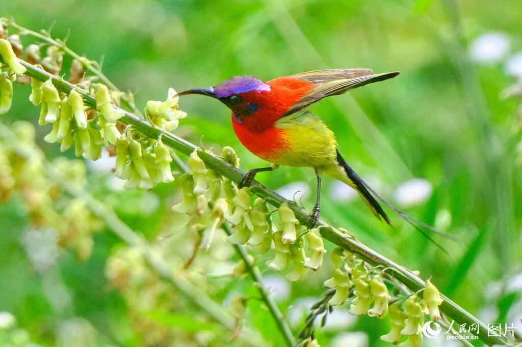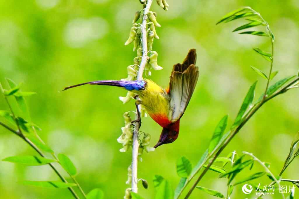盛夏来临,甘肃省陇南市成县植被茂密的南山一带,蓝喉太阳鸟在花丛林间觅食栖息,呈现鸟欢人和的生态美景。
