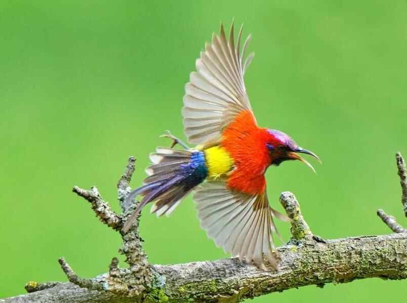 太阳鸟,远古传说中的凤凰神鸟,全世界共有十四种,中国有六种,其中蓝喉太阳鸟的主要分布区位于甘肃南部。蓝喉太阳鸟羽色艳丽,可以说是成县境内最美丽的鸟。它以花蜜和昆虫为食,在传播花粉和抑制害虫方面作用很大,被列入国家“三有”保护鸟类。