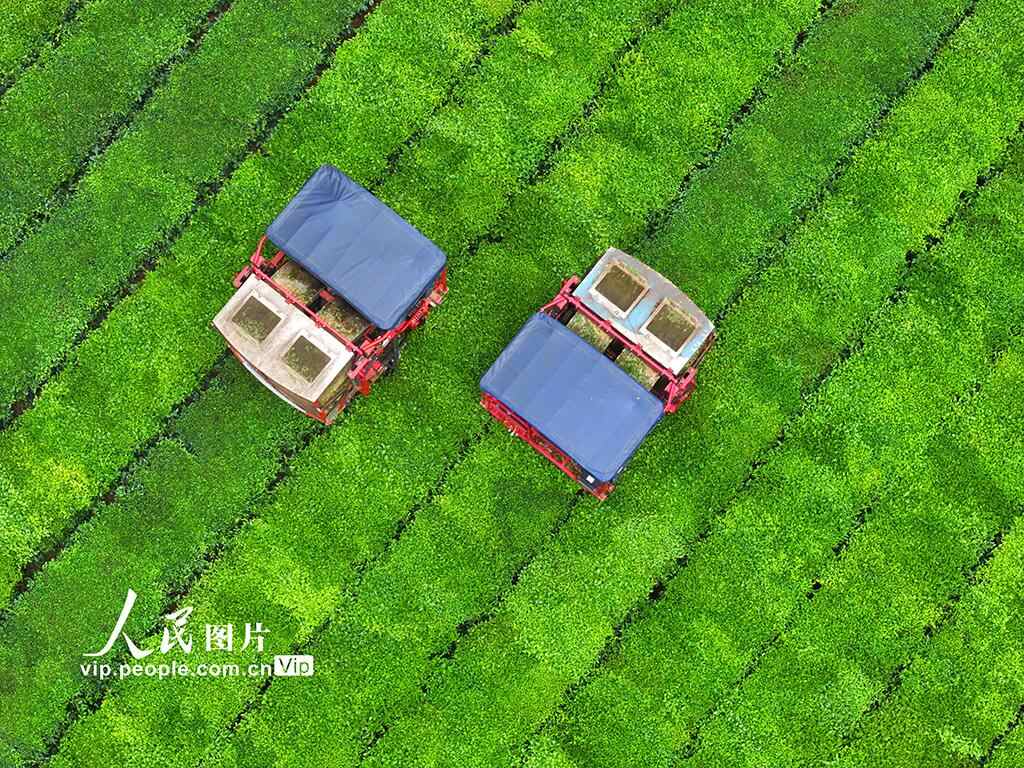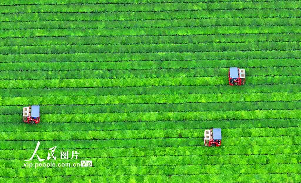 2025年6月16日,江西省吉安市泰和县泰和垦殖场生态茶园,工人驾驶采茶机正在采收夏茶。江西泰和县积极推进智慧农业发展,引进智能采茶设备采茶,实现“机器换人”,提高采茶效率,降低茶叶生产成本。邓和平摄(人民图片网)