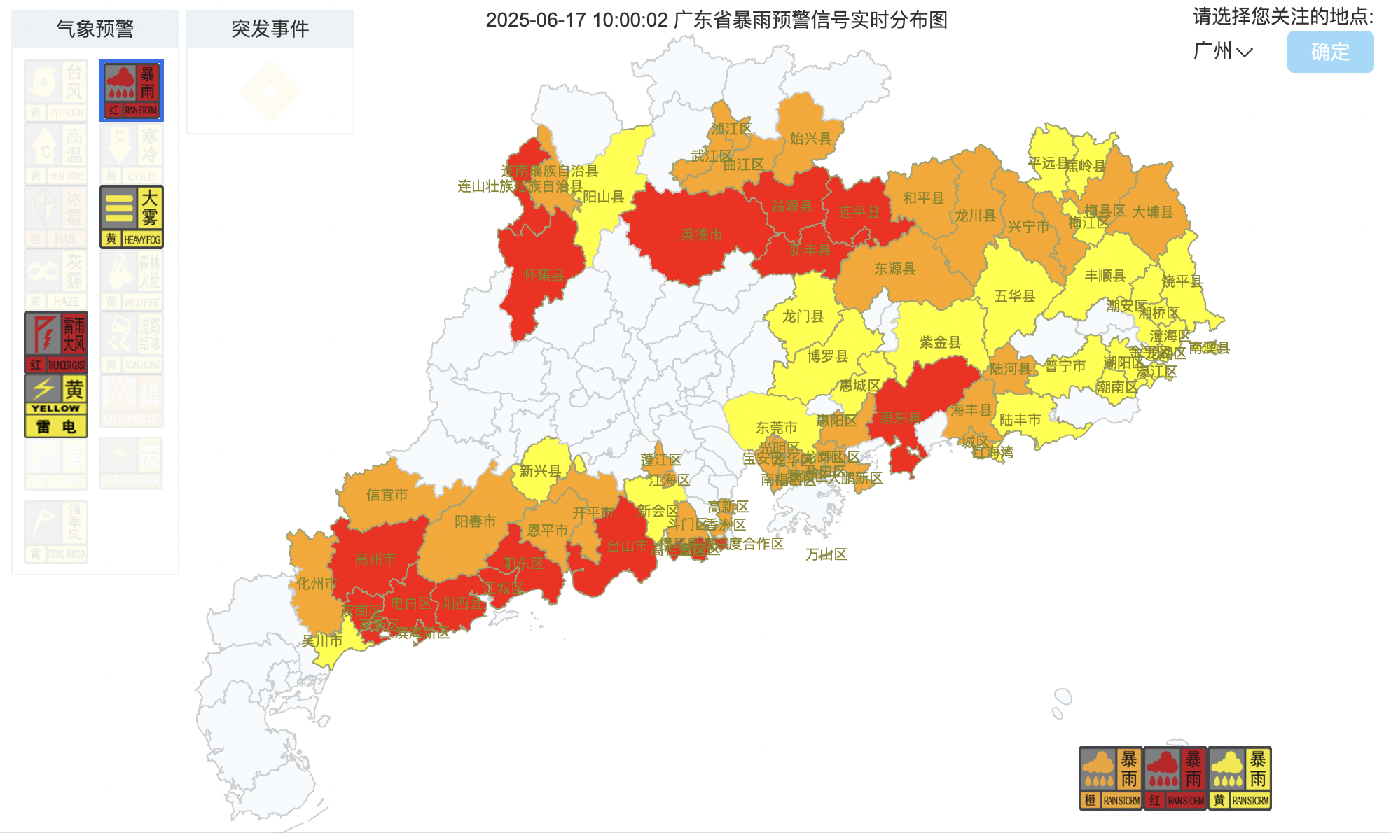 截至17日10时,广东多地继续发布暴雨红色预警信号。其中茂名、阳江、江门、肇庆、清远、韶关、惠州、河源等市范围内,均有市县区发布暴雨红色预警信号。