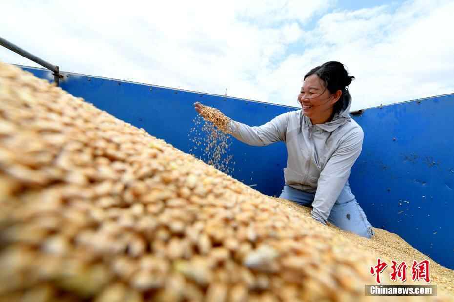 近日,河北省衡水市阜城县42.4万亩小麦收割进入尾声,当地调配1000余台小麦联合收割机、各类农业机械2500余台投入到“三夏”作业之中,确保夏粮颗粒归仓。图为6月16日,阜城县码头镇李晋庄村的农田里,正在装车的小麦。