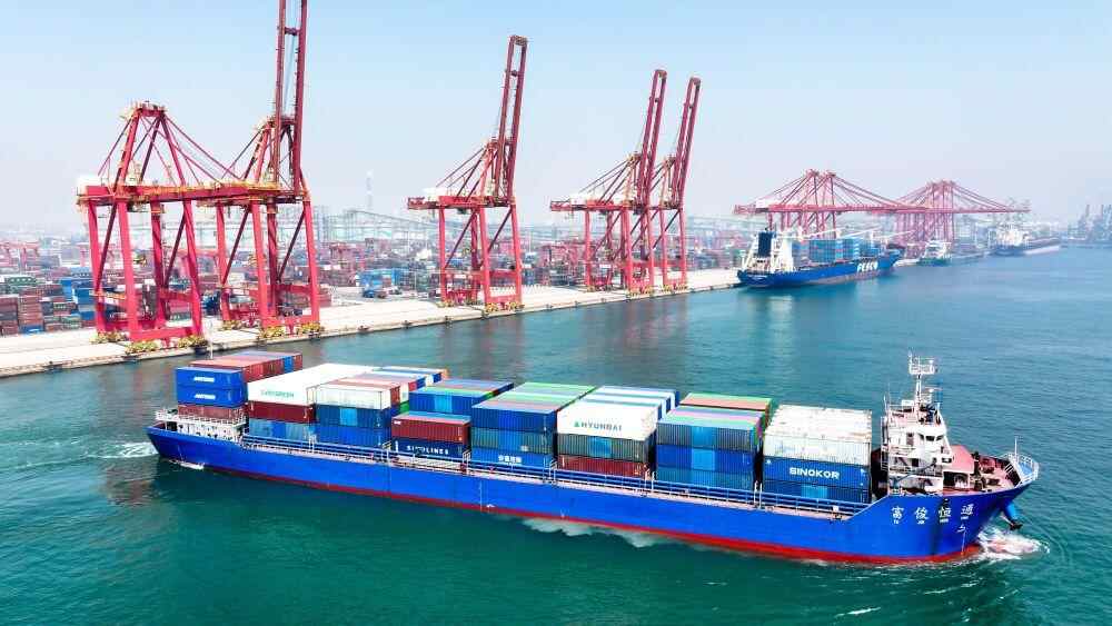 5月20日,在山东港口日照港集装箱码头,满载集装箱的船舶驶离港口。新华社记者 郭绪雷 摄