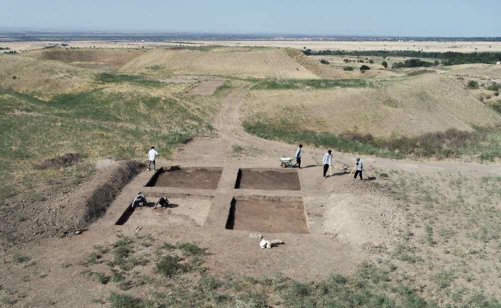 2023年8月9日,考古人员在中哈联合考古项目拉哈特遗址探方上工作(无人机照片)。从2017年开始,陕西省考古研究院与哈萨克斯坦伊塞克国家历史文化博物馆组成联合考古队,对拉哈特遗址及附近相关遗址开展考古调查与发掘工作。