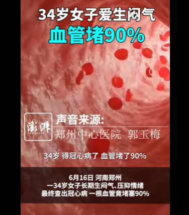 6月16日,河南郑州。一34岁女子长期生闷气、压抑情绪,最终查出冠心病,一根血管竟堵塞90%!长期生气、情绪压抑会导致内分泌紊乱、炎症反应加剧,甚至直接损伤血管。