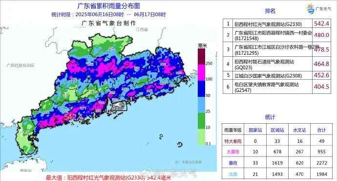 16日白天到17日早晨,从24小时累积雨量图可见,有两条雨带横扫广东,粤北南部、粤西沿海、珠江三角洲、粤东市县出现暴雨到大暴雨,局地特大暴雨。阳江、茂名、中山、珠海、湛江、江门等23个镇街出现超过250毫米的特大暴雨,阳江阳西县程村镇出现全省最大24小时雨量542.4毫米和最大1小时雨量142.6毫米。