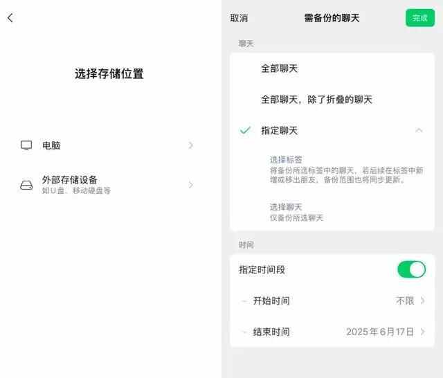 备份范围可以选择全部聊天或者指定聊天,也可以选择指定时间段。此外,用户还可开启自动备份,支持电量不足20%时暂停备份,以节省手机电量。