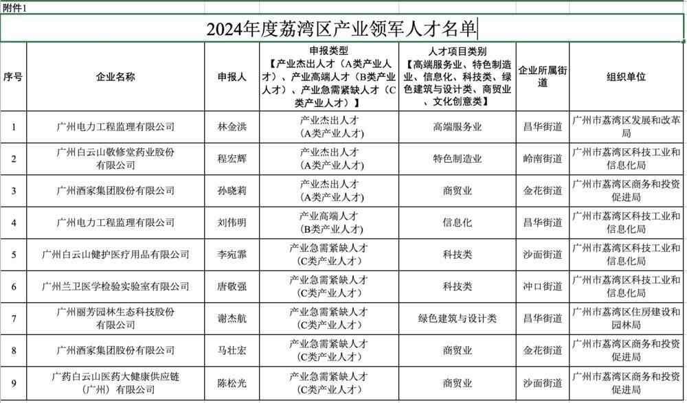 《通知》提到,根据《关于印发<广州市荔湾区产业领军人才(团队)支持计划实施办法>的通知》(荔科工信规〔2023〕2号)和《关于印发2024年度荔湾区产业领军人才(团队)认定申报指南的通知》(荔科工信〔2024〕132号),经用人单位申报、专家评审、征求有关单位意见、社会公示和荔湾区委人才工作领导小组审定同意,现将2024年度荔湾区产业领军人才(团队)名单印发。