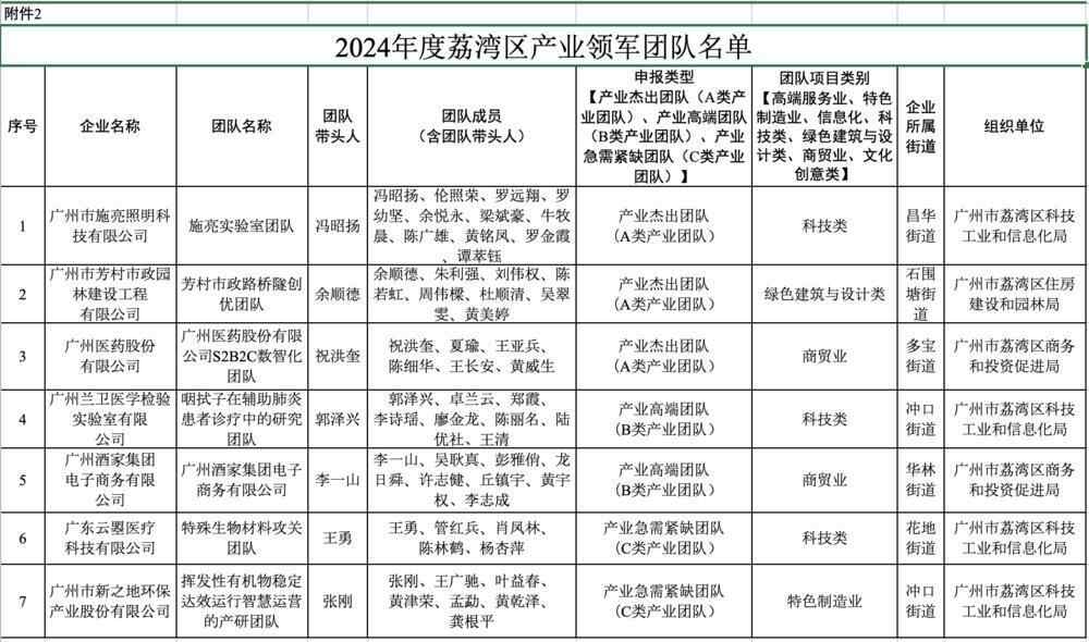 有7个团队入选“2024年度荔湾区产业领军团队名单”,这些团队涉及类别有科技类、绿色建筑与设计类、商贸业、特色制造业等。