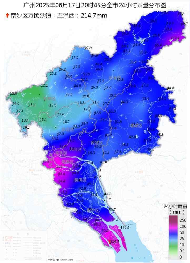 在广州,广州市气象部门统计,16日夜间至17日夜间,广州南部和中心城区出现大到暴雨局部大暴雨,其余地区出现中到大雨,雨时局部伴有6~7级阵风和雷电。截至17日20时50分,南沙区万顷沙镇十五涌西,录得全市24小时累积最大雨量214.7毫米。