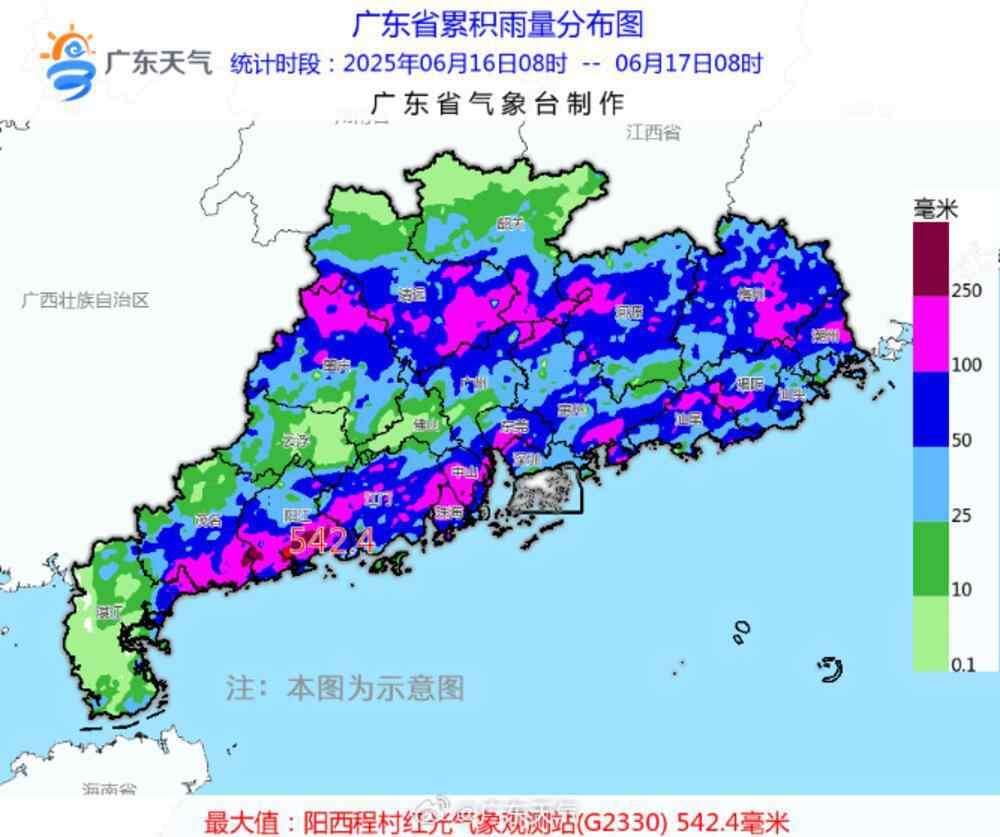 根据广东省气象部门观测和统计,16日白天到17日早晨,粤北南部、粤西沿海、珠江三角洲、粤东市县出现暴雨到大暴雨,局地特大暴雨。从16日8时到17日8时,广东有23个镇街录得超过250毫米的特大暴雨(分布在阳江、茂名、中山、珠海、湛江、江门),有333个镇街录得100毫米~250毫米的大暴雨,阳江阳西县程村镇录得统计时段全省最大雨量542.4毫米和最大1小时雨量142.6毫米。其余各市最大的镇街,包括茂名电白区望夫镇404.5毫米、中山市神湾镇280.5毫米、珠海斗门区白蕉镇278.7毫米。