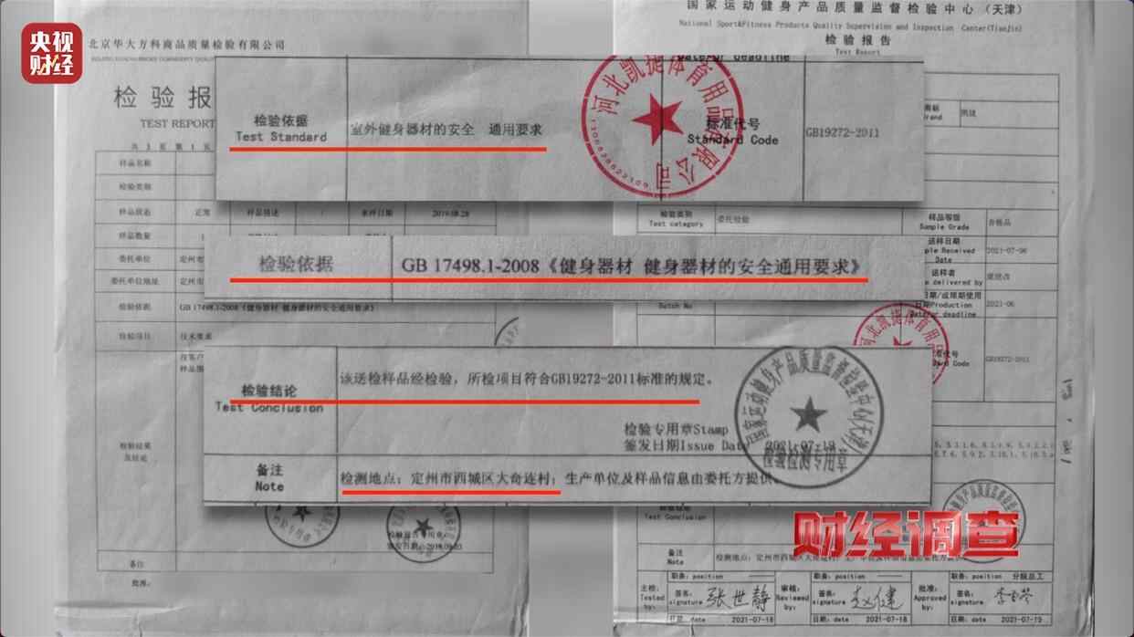 暗访中,部分非标器材生产企业向记者出示了检测合格证书,声称“不需要将器材送检,检测单位也不用来人,直接花钱买”。一份漏洞百出的“合格报告”,为非标公共健身器材披上了合规外衣。