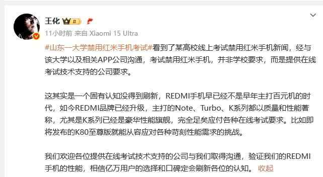 王化称,看到了某高校线上考试禁用红米手机新闻,经与该大学以及相关APP公司沟通,考试禁用红米手机,并非学校要求,而是提供在线考试技术支持的公司要求。