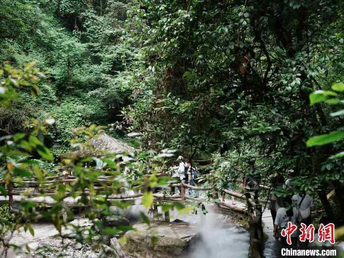 6月15日,游客在贵州江口县亚木沟风景区游玩。中新社记者 周燕玲 摄
