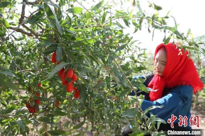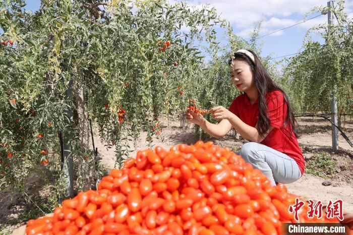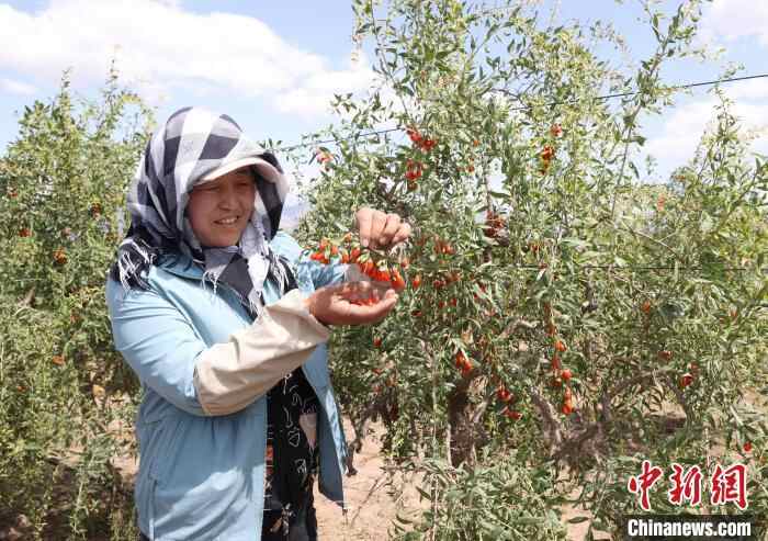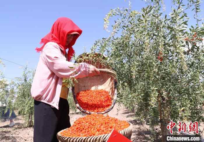 6月15日,工作人员在宁夏银川市百瑞源殷红子熟枸杞庄园采摘枸杞。中新社记者 于晶 摄