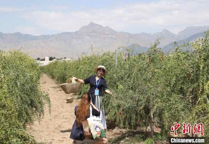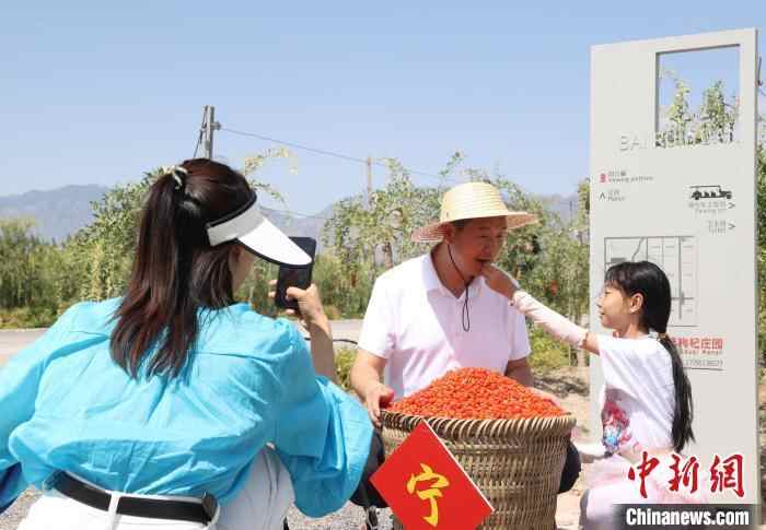 6月15日,游客在宁夏银川市百瑞源殷红子熟枸杞庄园拍照留念。中新社记者 于晶 摄