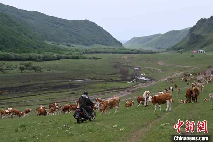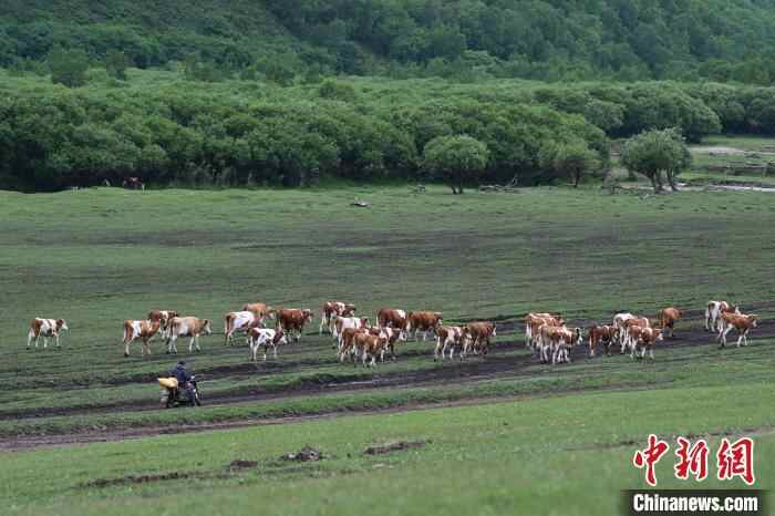 6月15日,内蒙古通辽市扎鲁特旗,牧民骑摩托车赶牛转场。中新社记者 刘文华 摄
