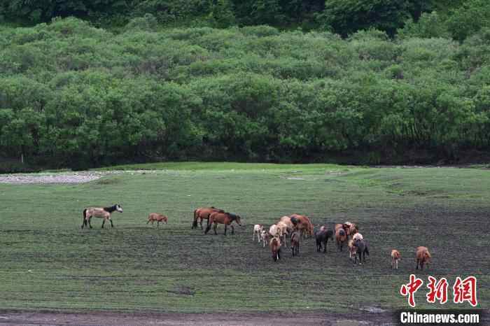 6月15日,内蒙古通辽市扎鲁特旗,马群在转场途中缓慢行进。中新社记者 刘文华 摄