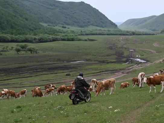 6月15日,内蒙古通辽市扎鲁特旗,牛群在转场途中悠闲吃草,牧民骑摩托车跟随。中新社记者 刘文华 摄