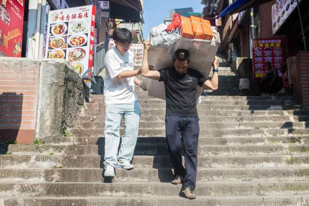 ↑2015年4月4日,冉光辉扛着重物走下楼梯。