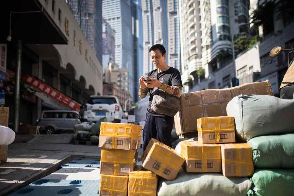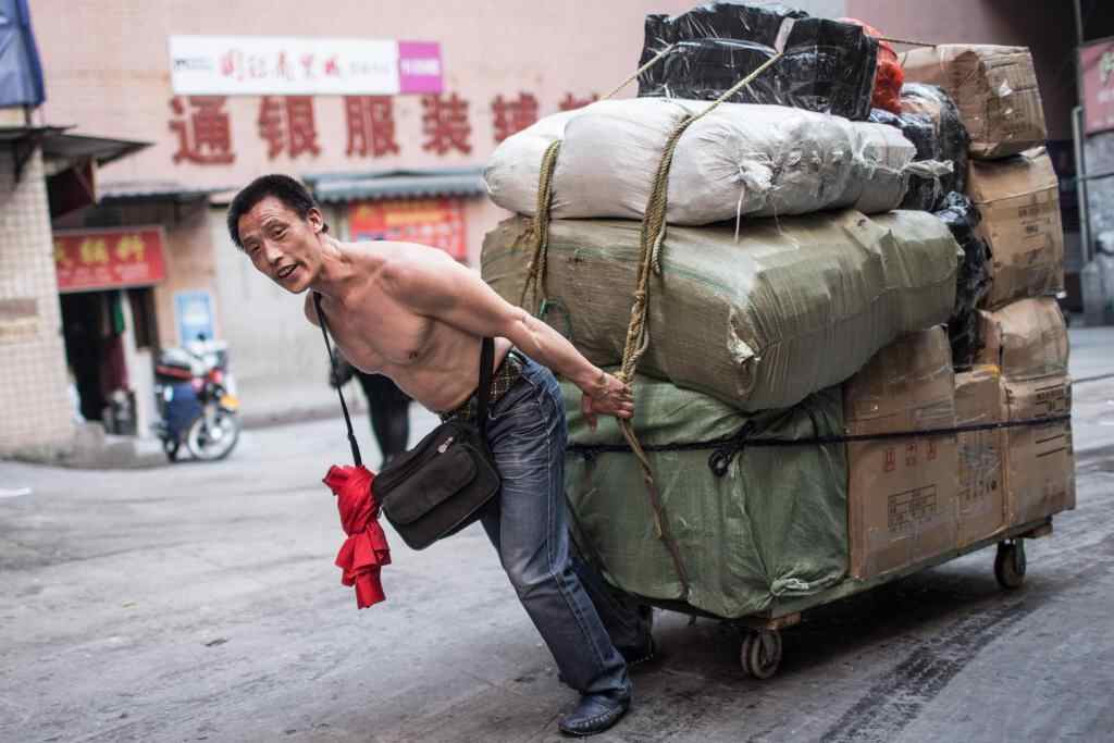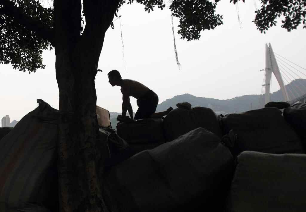 ↑2013年5月24日,冉光辉在堆积如山的货物里找寻自己要搬的货物。