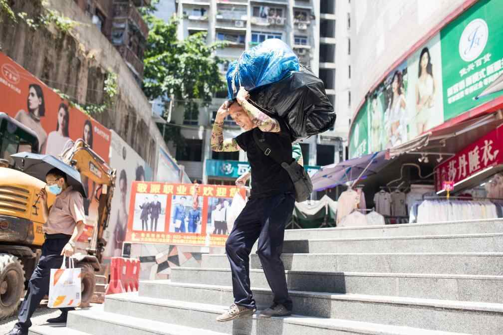 ↑2023年7月22日,冉光辉扛完一袋货物后稍作休息。